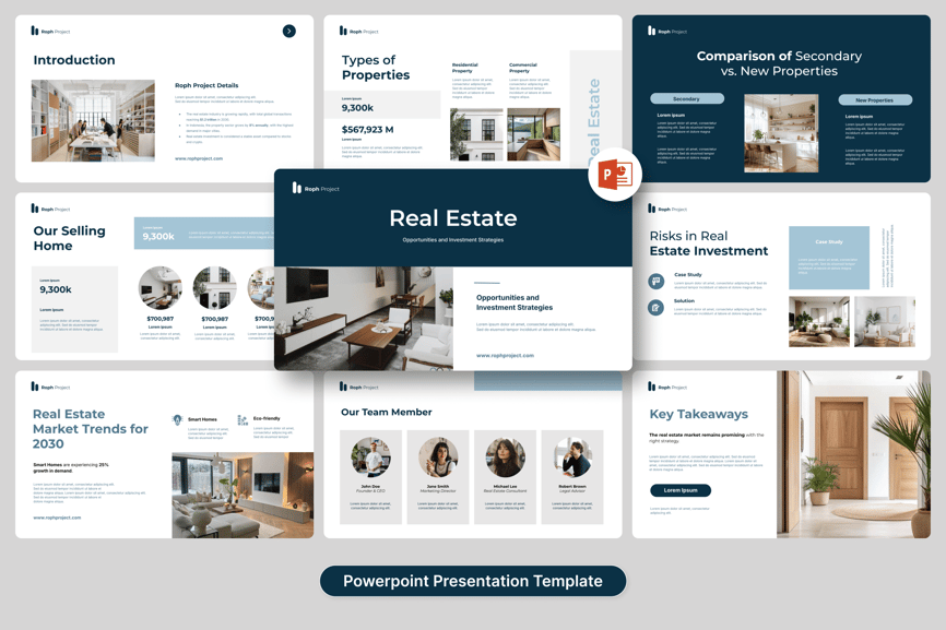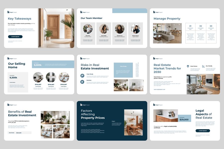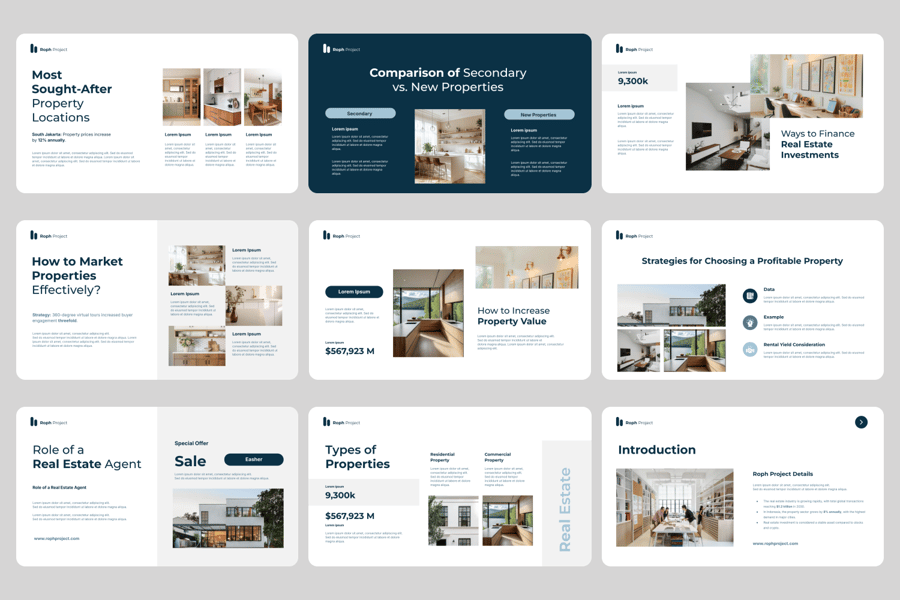此模板非常适合房地产经纪人、房地产开发商、投资公司、顾问和营销团队,可用于项目推介、达成交易或展示投资组合。可用于客户演示、销售提案、投资推介、房产展示和商业计划,以突出商机并推动业绩增长。