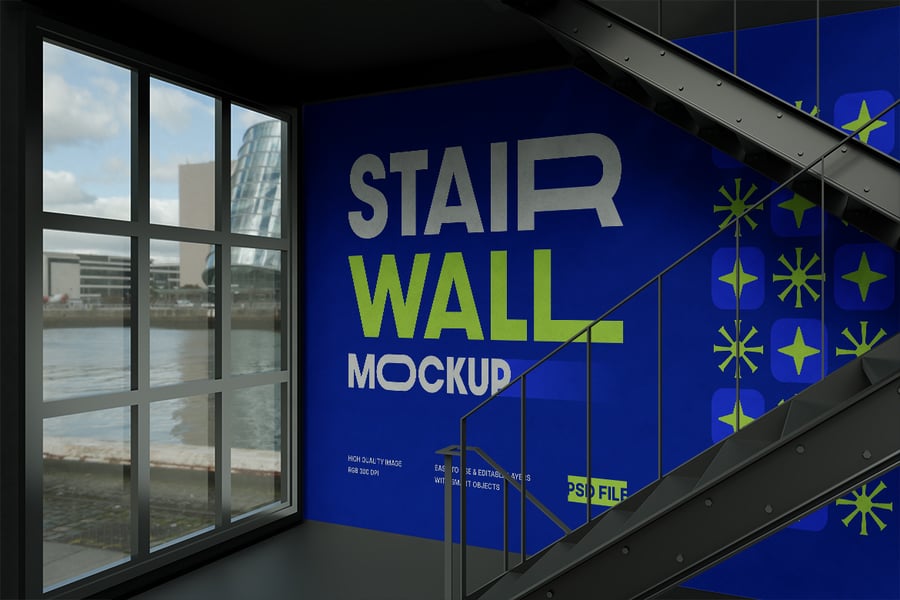 这款**楼梯墙样机**能将您的楼梯墙打造成引人注目的品牌展示空间。样机采用现代室内设计,配有落地窗和工业风金属楼梯。巨大的墙面空间非常适合展示导视系统图形、环境品牌标识、活动宣传或壁画设计,并可搭配鲜艳的色彩和逼真的光照效果。只需使用智能对象替换您的设计稿,即可快速获得极具冲击力的视觉效果,用于客户提案、演示或作品集展示。