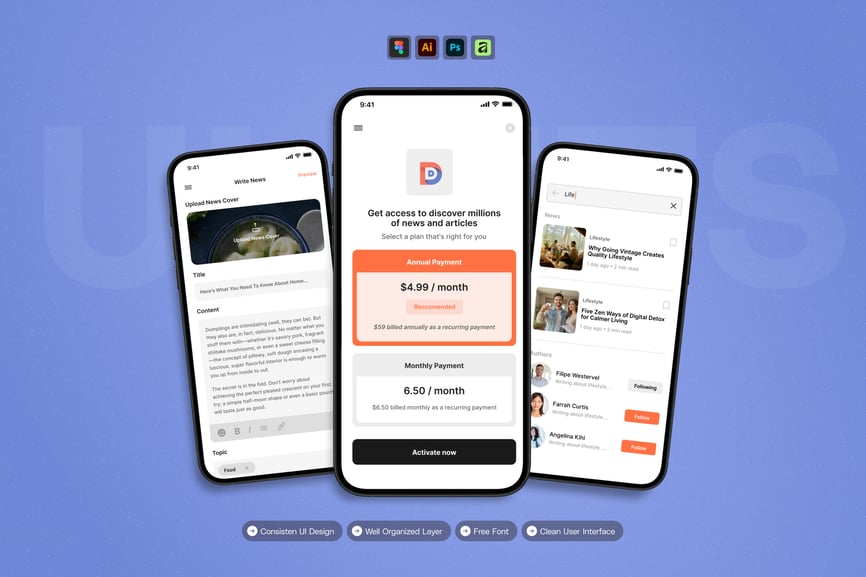 这款新闻 UI 套件的设计重点在于易用性和一致性,让您轻松创建美观实用的移动应用。每个元素都经过精心构建,完全可定制,并可随时适配您的品牌。无论您是设计社交应用、电商应用还是效率工具,这款套件都能让您灵活自如地将创意变为现实。