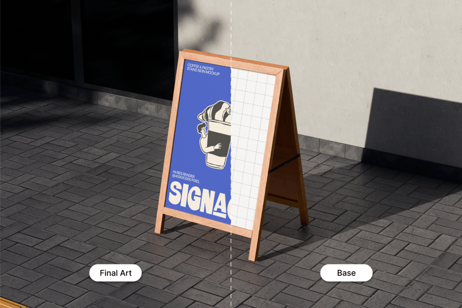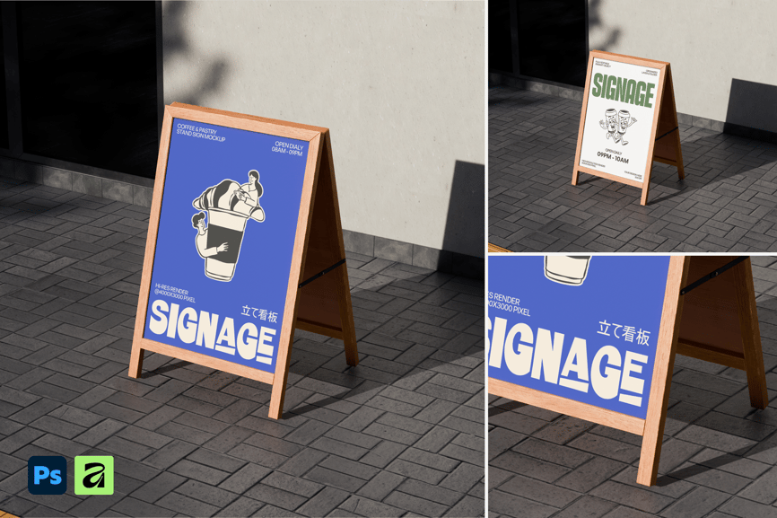 **高分辨率木质A字架店铺招牌模型**旨在清晰、逼真地展示户外广告,并营造强烈的街头视觉冲击力。该模型展示了一个放置在城市人行道上的A字架招牌,呈现出逼真的街头效果,完美模拟了真实的零售和咖啡馆环境。