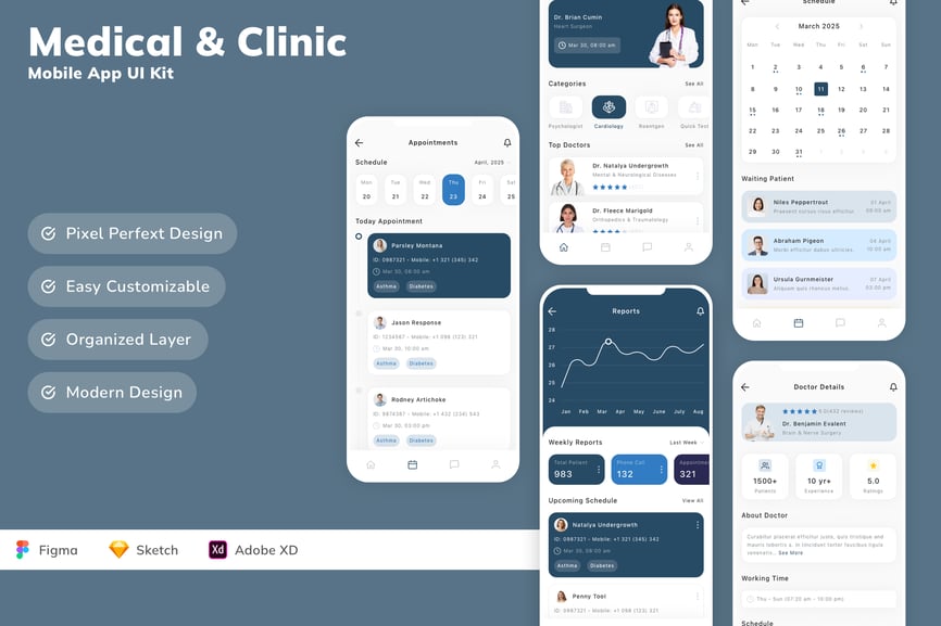 每个屏幕都可完全自定义,易于使用,并针对 Figma、Sketch 和 Adobe XD 进行了精心设计。