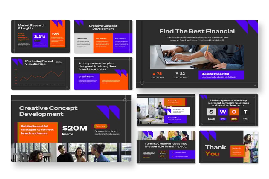 是一款创意风格的演示文稿模板,非常适合用于营销活动、广告、战略、研究、概述、品牌、品牌推广、项目提案等多种用途。