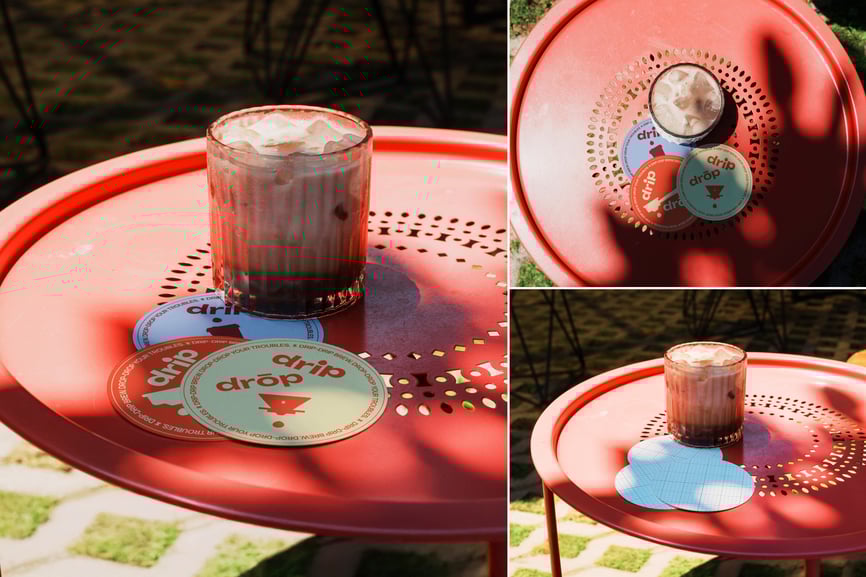 将您的杯垫设计拖入智能对象图层,即可立即查看堆叠效果。只需几秒钟即可调整饮料液位、冷凝水珠或草地模糊效果,以模拟清晨露水或午后阳光。轻松更改杯垫材质(牛皮纸、软木、石材)和玻璃杯颜色,以匹配您的冷饮品牌形象。
