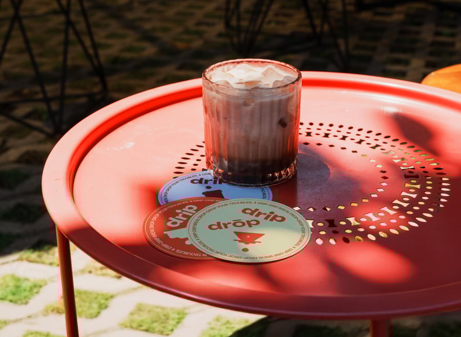 用这款**明亮的户外杯垫样机**捕捉完美的夏日清凉体验。一杯**冰镇饮品**置于一叠**圆形杯垫**之上,采用**近距离、略微高角度拍摄**,突显了水汽、纹理和鲜艳的色彩。背景是沐浴在**金色阳光**下的**葱郁绿草**,营造出清新宜人的咖啡馆花园氛围——非常适合冰咖啡、柠檬水或精酿苏打水品牌推广。