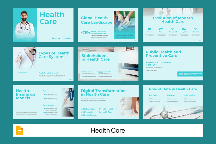 使用**医疗保健 Google 幻灯片模板**,尽情展现您的创意。此模板专为医院、诊所、医疗专业人员和医疗保健机构设计。它采用现代化的布局和可自定义的幻灯片,是展示医疗服务、患者护理项目、研究成果、治疗方案和医疗保健创新成果的理想之选。无论用于专业报告、医学会议还是组织规划,它都能帮助您清晰、可信且有效地传达复杂的医疗保健信息。