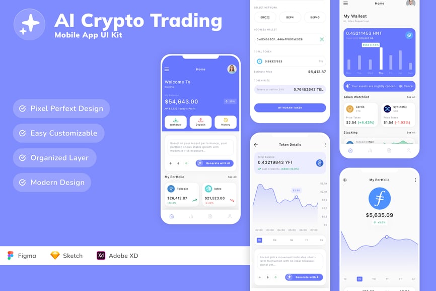 每个屏幕都可完全自定义,易于使用,并针对 Figma、Sketch 和 Adobe XD 进行了精心设计。