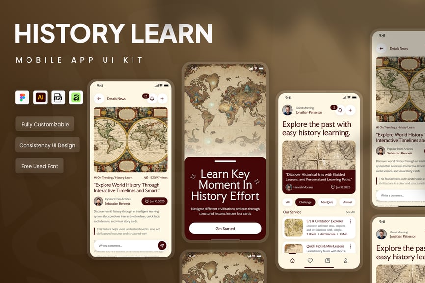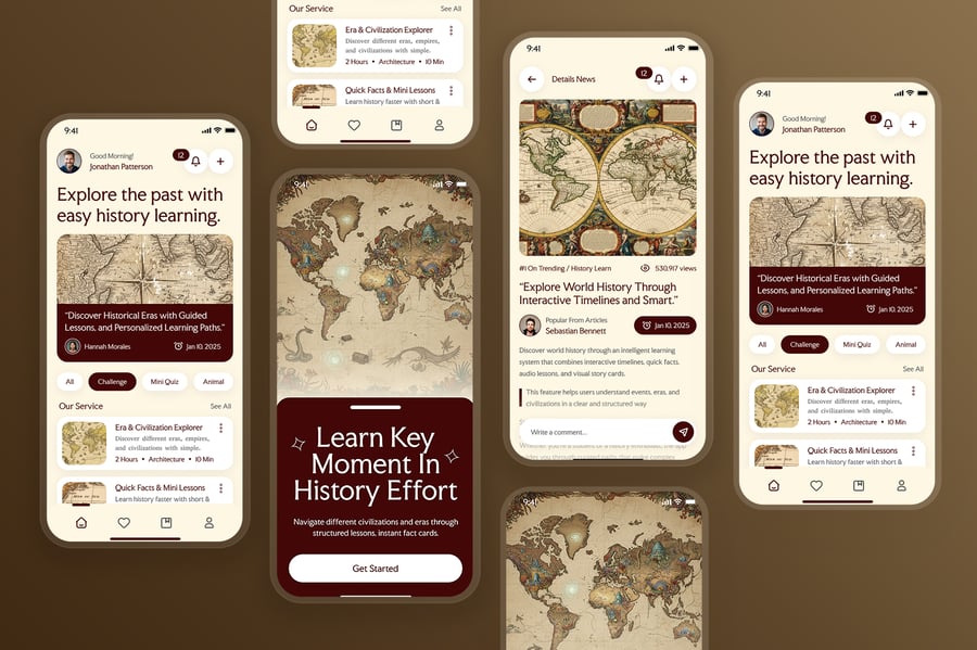 隆重推出一款寓教于乐的互动式历史学习移动应用UI套件,专为专注于世界历史、时间轴、古代文明、历史人物、测验、学习进度和多媒体课程的数字学习平台而设计。该界面将简洁的学术布局与引人入胜的视觉效果相结合,旨在提升学生的专注力和学习体验。