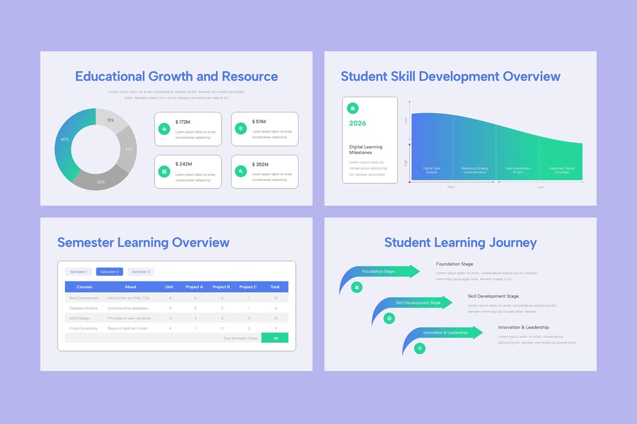 这款易于使用且设计精美的教育模板,可助您提升学校或学术演示水平。该模板提供专业设计的幻灯片,涵盖关键业务要点。凭借现代化的布局、引人入胜的图形和可编辑的图表,它增强了故事叙述和数据可视化效果,让您能够为任何行业打造可定制的、极具吸引力且能带来实际成效的演示文稿。