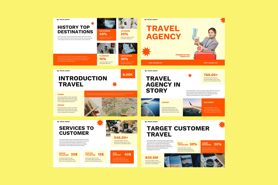 使用这款旅行社谷歌幻灯片演示模板,给投资者留下深刻印象,并清晰传达您的愿景。此演示模板专为旅行社、旅游运营商和酒店业专业人士设计。它能帮助您以完美的视觉效果和信息平衡,展示目的地亮点、旅游套餐、行程安排和客户体验。模板包含多种幻灯片布局,涵盖公司简介、服务项目、定价方案、季节性促销活动和客户评价——所有内容都旨在吸引并留住您的观众。