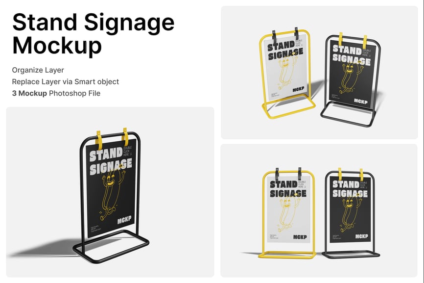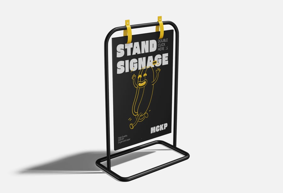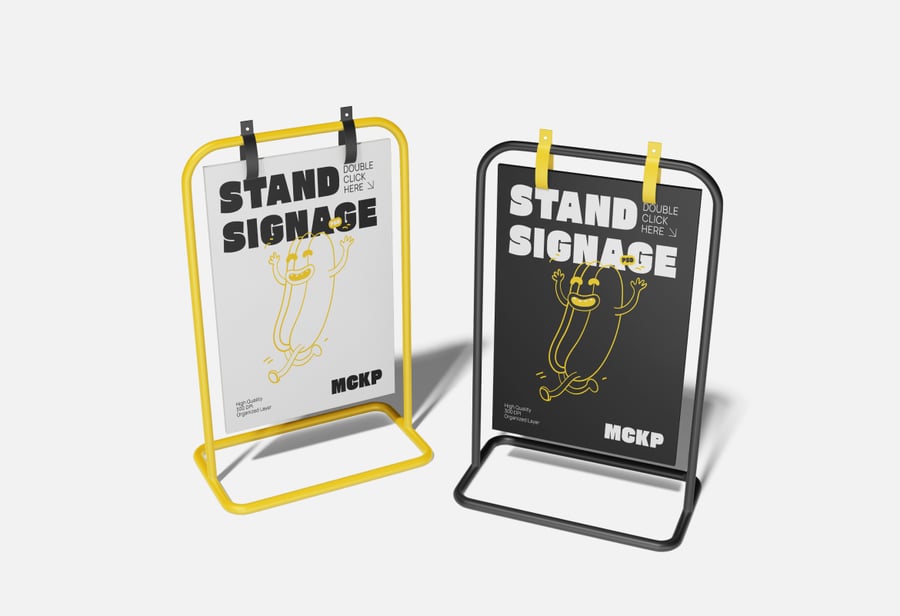 这款展架标牌模型是一款专业的 Photoshop 模板,旨在以简洁逼真的方式展示独立式标牌、宣传板和零售展示图文。它包含三个高分辨率 PSD 场景,从多个角度展示金属框架展架标牌,突出其坚固的结构、悬挂夹和自然阴影,营造出真实的视觉效果。