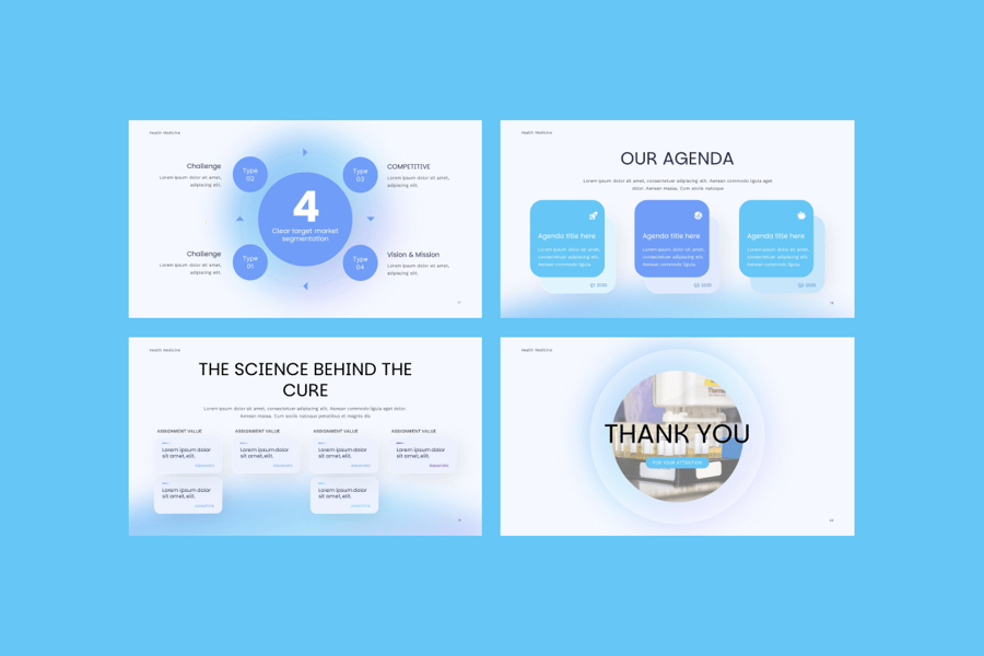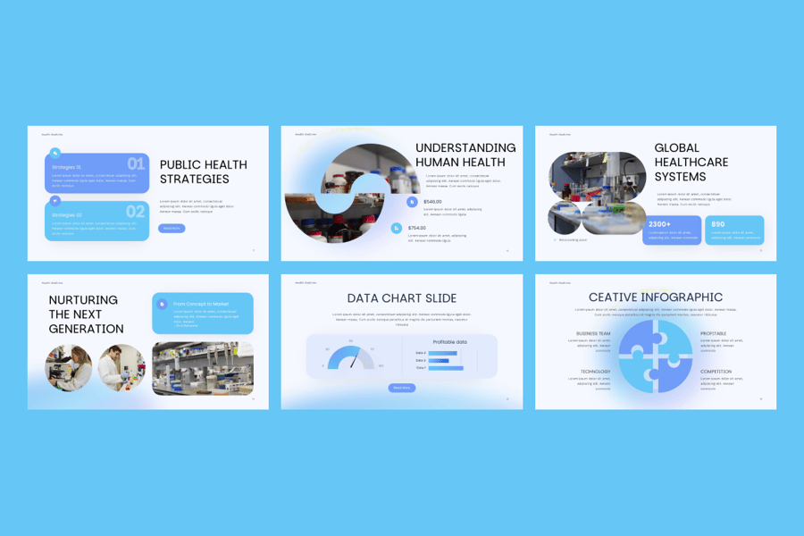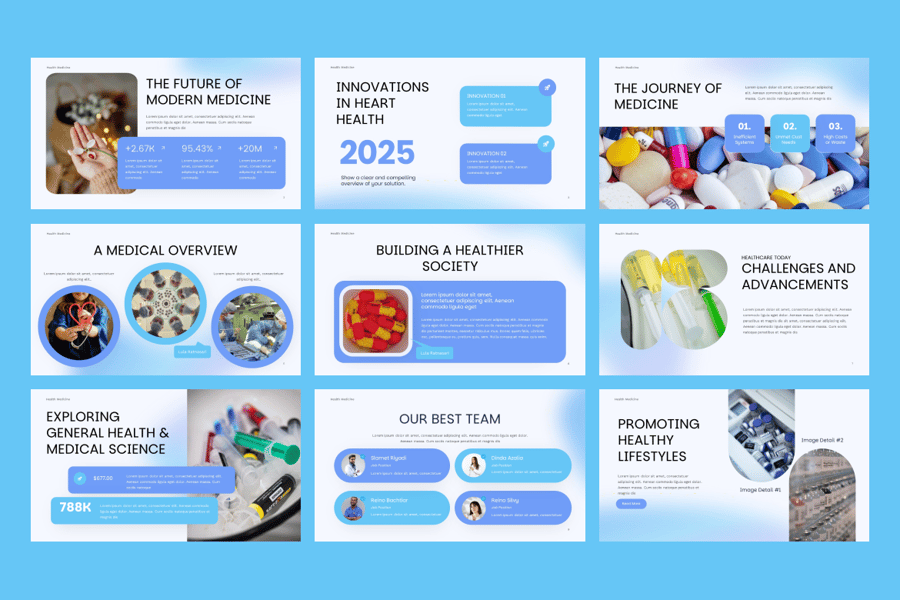 使用“健康医学”Google幻灯片演示模板,提升您的医疗保健演示效果。该模板设计现代、简洁、专业,专为医疗专业人士、医疗机构、医院、诊所、制药公司和健康企业量身打造。模板包含完全可编辑的幻灯片、医学信息图、数据图表、患者护理流程图和医疗服务布局,助您清晰地传达复杂信息。无论您是准备医疗报告、医院简介、研究报告还是健康宣传活动,这款Google幻灯片模板都能完美兼顾视觉设计和功能性。
