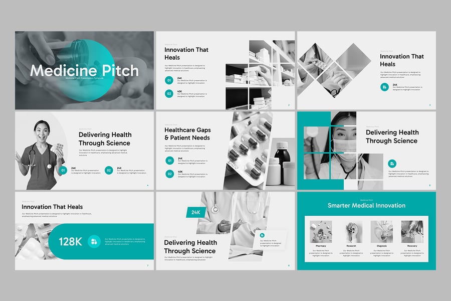 这款医药项目路演演示模板简洁现代,设计精美,专为医疗保健行业量身打造。它适用于投资者、利益相关者、医疗保健创始人、生物技术初创公司、诊所、医院和制药公司,助您清晰自信地进行强有力的路演。