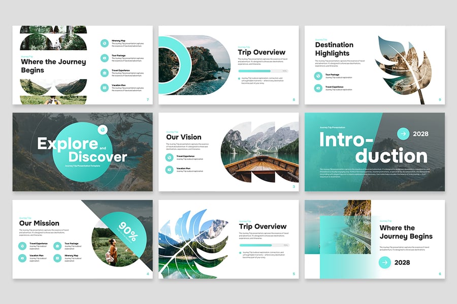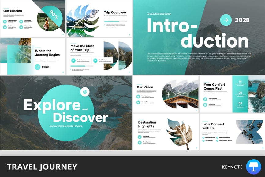 这款“旅程之旅”演示模板旨在将您的旅行主题内容转化为引人入胜的视觉体验。它专为现代探险家、创意机构、旅行创业公司以及任何想要展现旅程、发现和转变的人士而设计,为您提供了一个清新专业的平台,助您讲述您的旅程故事。