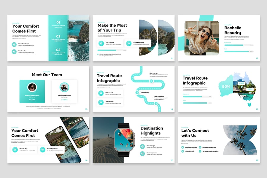 在琳琅满目的演示模板中,“旅程之旅”演示模板的独特之处在于它专注于旅行、动态和故事讲述。该模板的设计如同一个叙事载体——每一张幻灯片都精心构建,引导观众踏上一段旅程:从出发到目的地,从构思到完成。其美学风格力求精致而不繁杂,让您的内容和图像得以充分展现,同时保持整体的专业性。