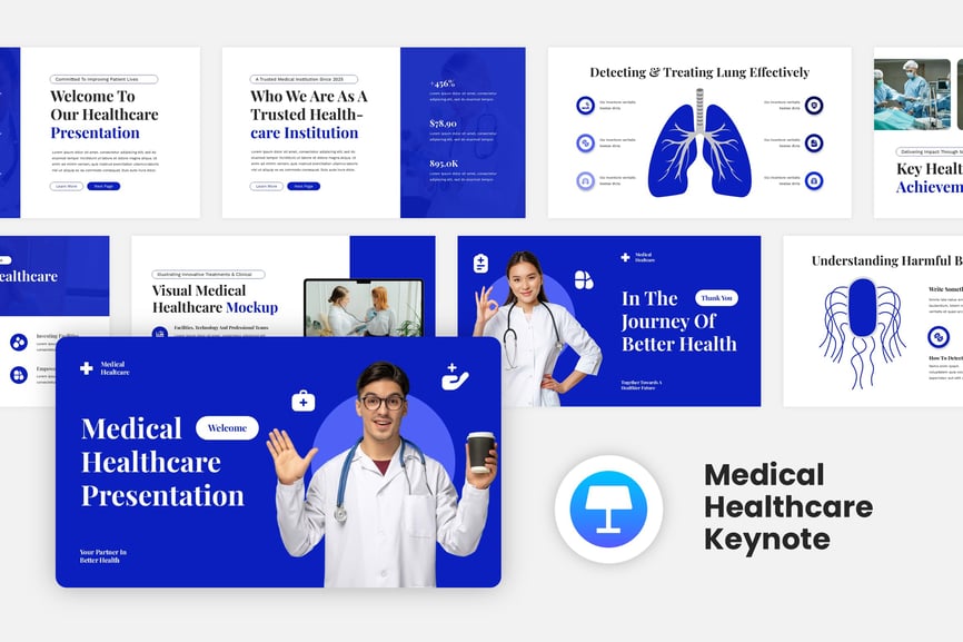 **医疗保健主题演讲模板**,采用创意主题。此模板可满足您的各种演示需求,提供多种主题和用途,并允许您更改文本、图像和颜色。