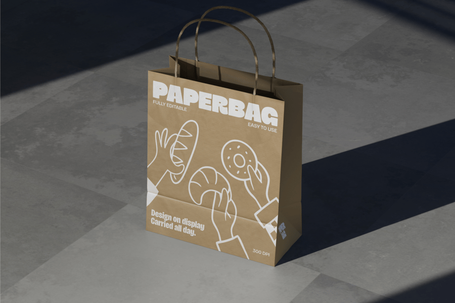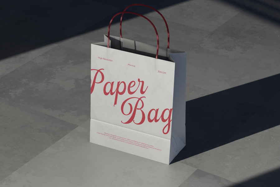 这款高品质奢华购物纸袋样机旨在打造精致的包装和品牌体验,并着重突出零售效果。场景中,一个购物袋置于简洁的摄影棚环境中,使您的产品设计成为视觉焦点。柔和的灯光和逼真的表面触感营造出自然的阴影深度,增强了真实感,同时又不会分散注意力。