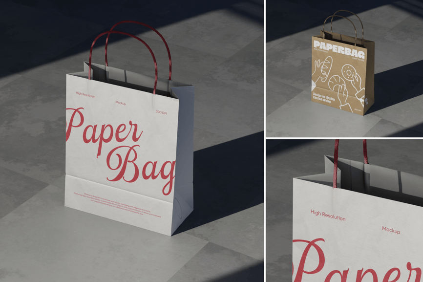 这款手提袋表面呈现出真实的纸张纹理、柔和的折痕和利落的边缘,搭配精致的绳索手柄,更添高级奢华感。中性色调的地面和背景营造出简洁现代的氛围,使其适用于各种营销和展示需求。