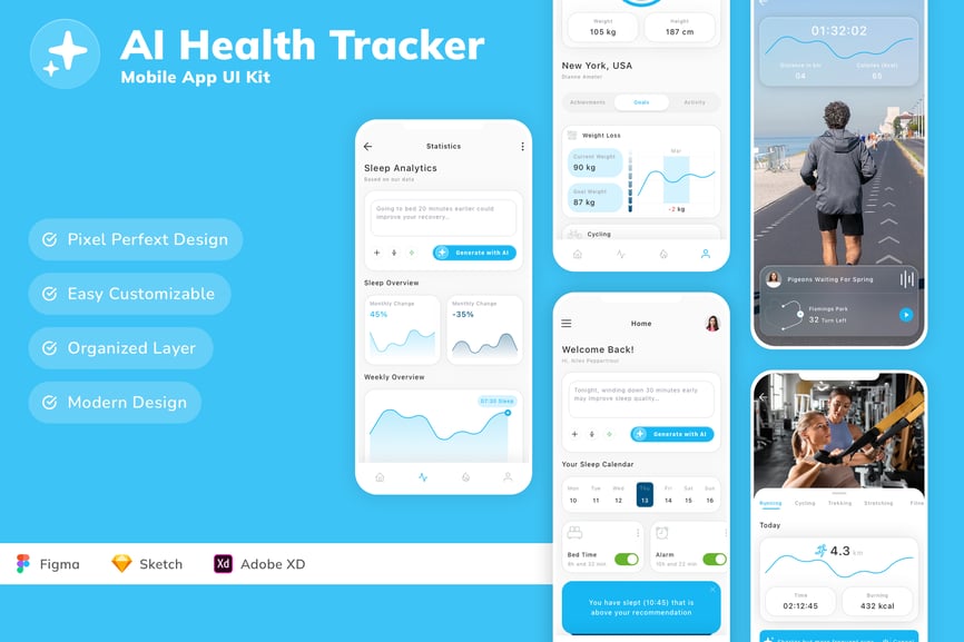 每个屏幕都可完全自定义,易于使用,并针对 Figma、Sketch 和 Adobe XD 进行了精心设计。