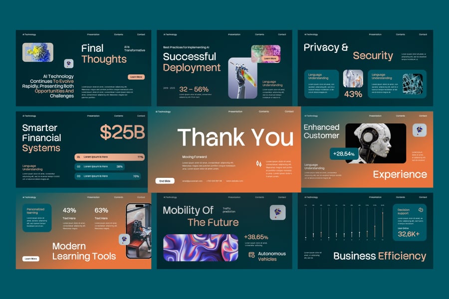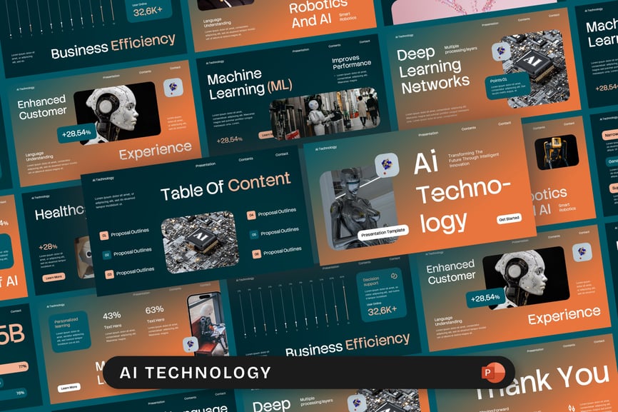 无论您是推销人工智能产品、展示机器学习数据、展示研究成果,还是解释自动化工作流程,此模板都能为您提供进行引人入胜且专业的演示所需的所有工具。