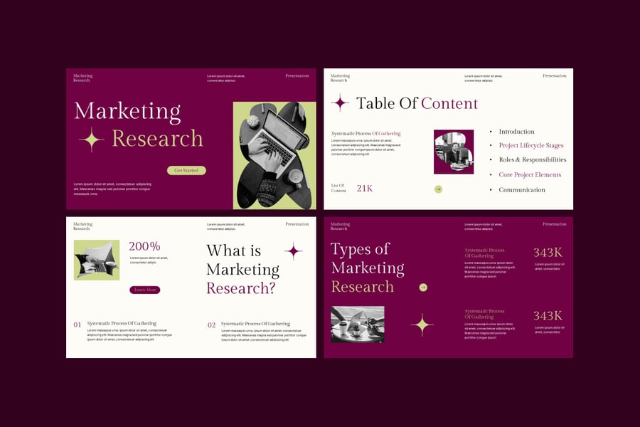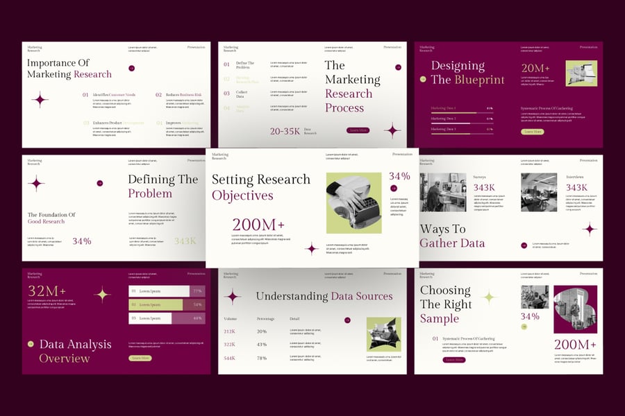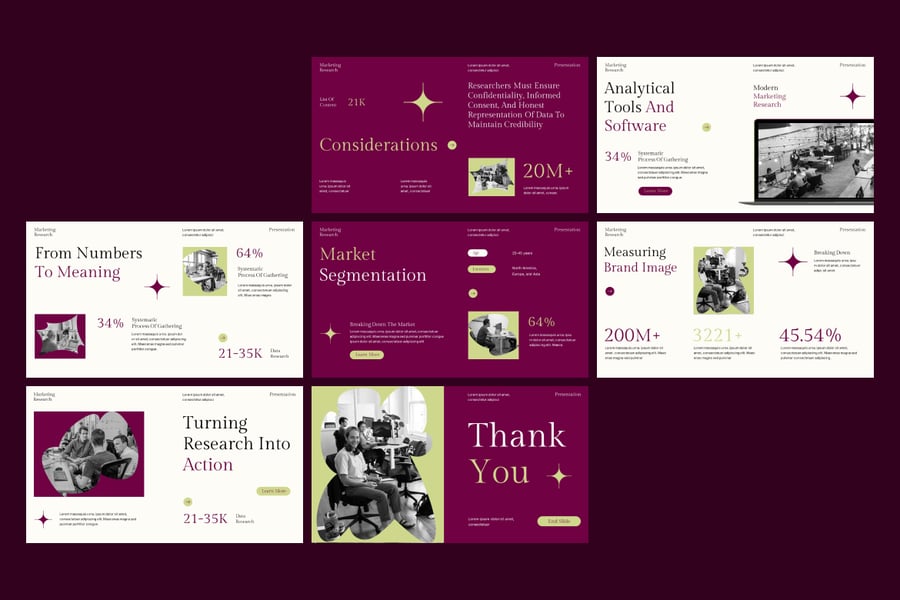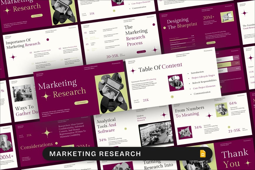 使用市场调研谷歌幻灯片演示模板,自信地展示数据驱动的洞察。这是一款专业且现代化的工具包,旨在可视化市场数据、买家行为、细分分析、业务预测和产品研究演示。适用于市场营销人员、分析师、顾问、创业公司创始人以及企业团队。