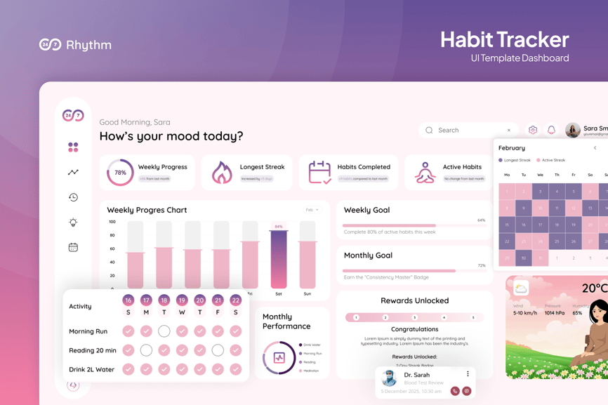 这款粉彩色系的习惯追踪仪表盘用户界面模板,呈现柔和、以健康为中心的界面,旨在可视化个人成长和日常习惯。它包含每周进度概览、习惯连续记录、已完成活动、目标追踪模块、日历热图、活动清单、每月绩效图表和奖励元素。