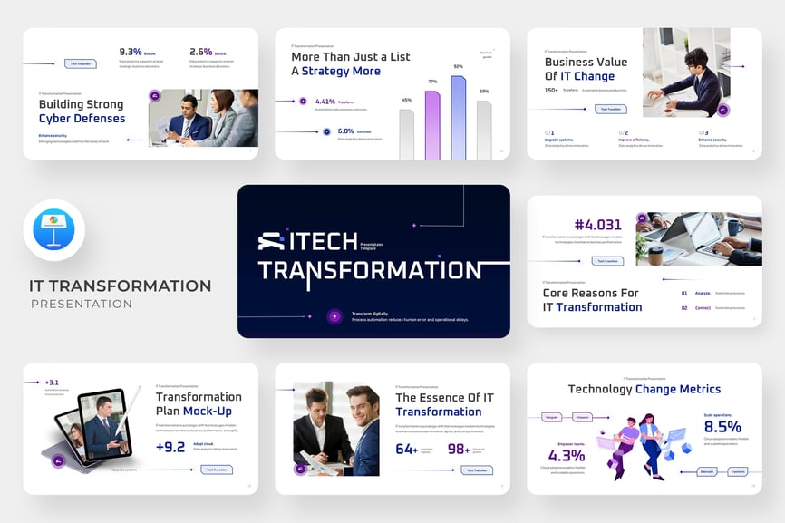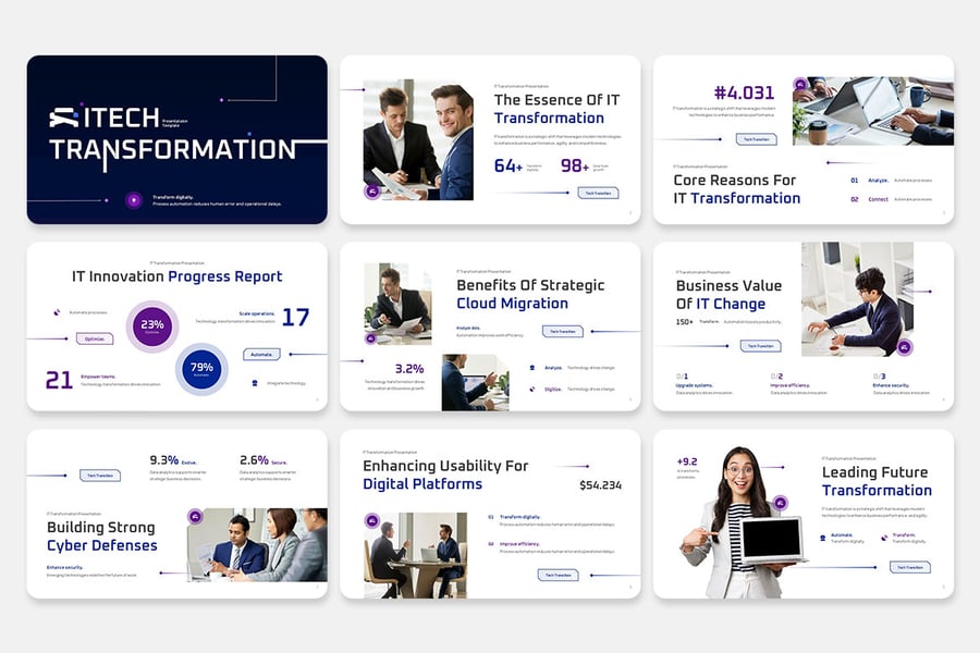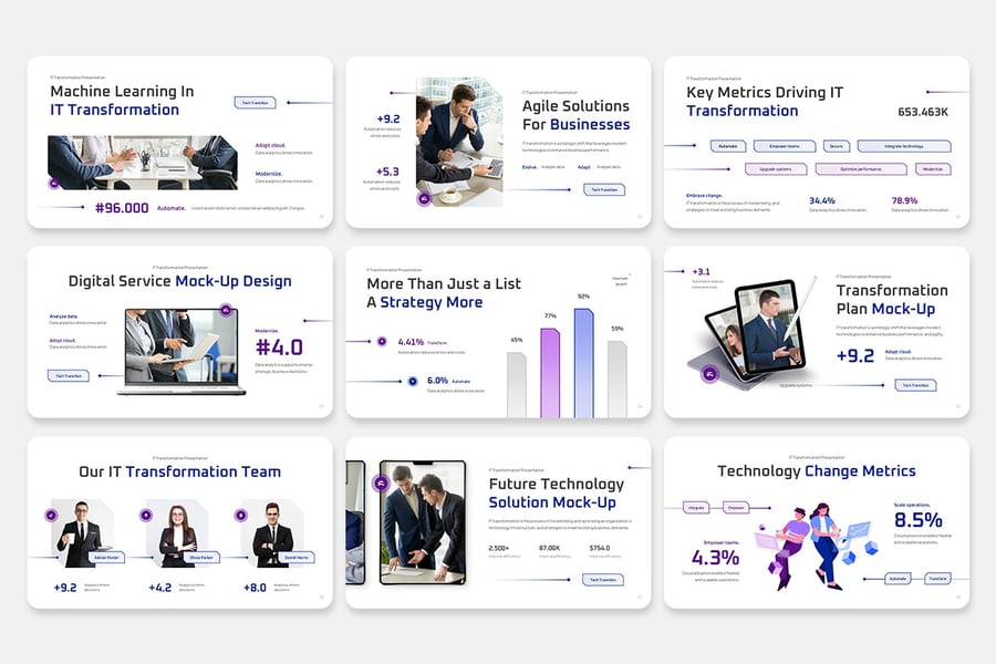 它条理清晰、逻辑严谨,使买家无需花费任何设计精力,即可讲述一个引人入胜的 IT 转型故事——从现状诊断、战略重点到实施和效益实现。非常适合咨询公司、培训项目、内部数字化实验室、企业变革计划或客户提案。