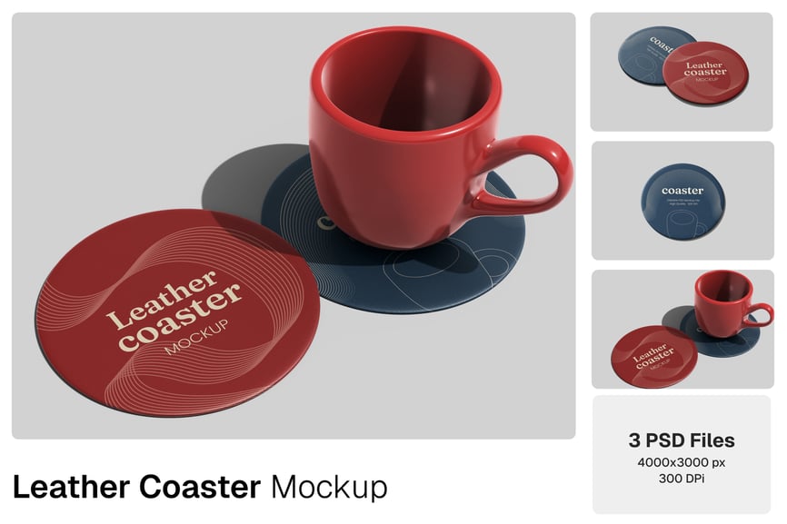 **适用对象**:产品设计师、品牌工作室、促销品创作者以及需要以逼真且精致的方式展示皮革杯垫设计的网店店主。非常适合展示品牌标识、咖啡厅配件、企业礼品、个性化杯垫设计、产品预览或客户提案等需要简洁高品质展示的场合。