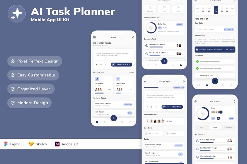 每个屏幕都可完全自定义,易于使用,并针对 Figma、Sketch 和 Adobe XD 进行了精心设计。