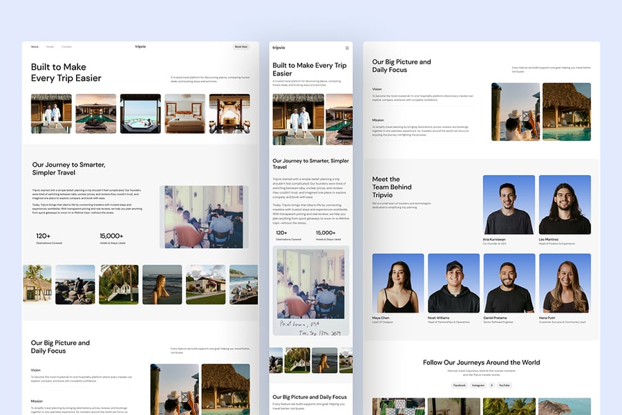 酒店网站要想成功,关键在于降低用户的不确定性。访客希望快速比较不同选项,了解各项服务内容,并安心预订。Tripvio 的设计正是基于这种用户需求。酒店页面支持筛选和浏览功能,而酒店详情页面则通过清晰的设施、房型选择和真实用户评价,让信息一目了然。结合醒目的行动号召按钮和便捷的联系页面布局,Tripvio 打造了完整的预订体验,并可根据不同酒店类型进行调整,从精品酒店到全球预订平台,都能轻松驾驭。