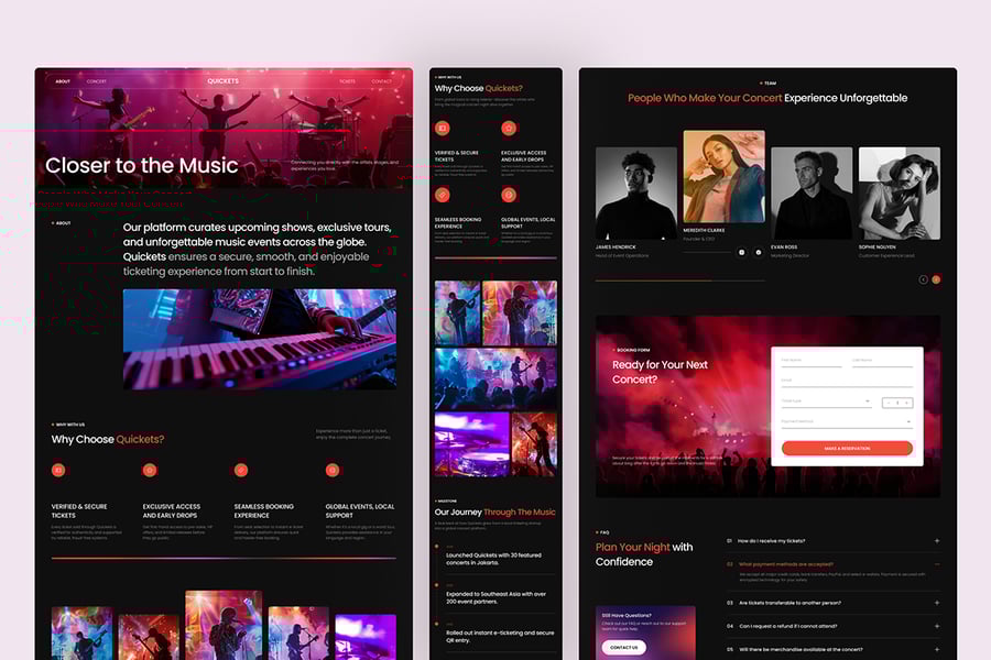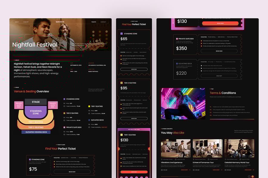 Quickets 不仅仅是一个简单的着陆页,它是一个完整的现场活动网站基础,其中动态图像、霓虹渐变和直观的内容部分共同作用,在预订过程的每一步都展现出活力、可靠性和便捷性。