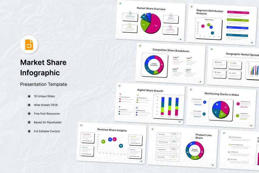 使用这款市场份额信息图表演示模板,清晰地展示您的竞争洞察,非常适合在战略会议上进行定位和分析。其醒目的布局有助于突出关键指标,并使复杂的数据易于理解。