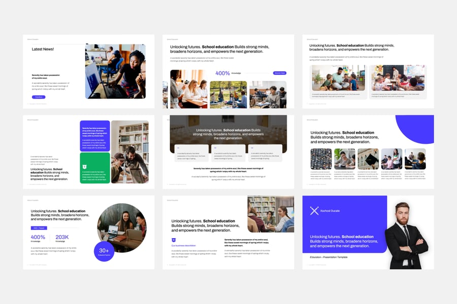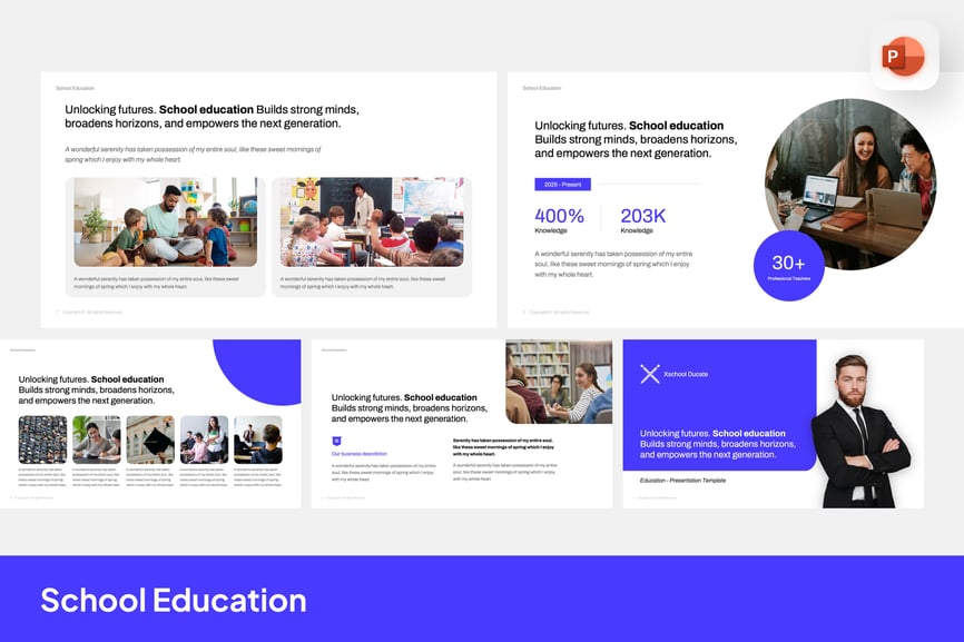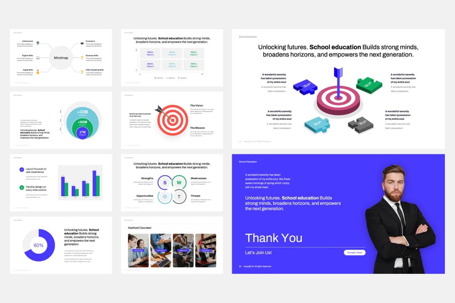 这款学校教育 PowerPoint 模板设计现代、简洁、专业,旨在突出展示教育项目、机构发展和学术成就。它采用极简布局、数据驱动图表、SWOT 分析和引人注目的信息图,帮助教育工作者和管理人员清晰有效地呈现信息。该模板是学校、大学、培训中心和教育相关机构展示成就、学习策略和未来目标的理想之选。