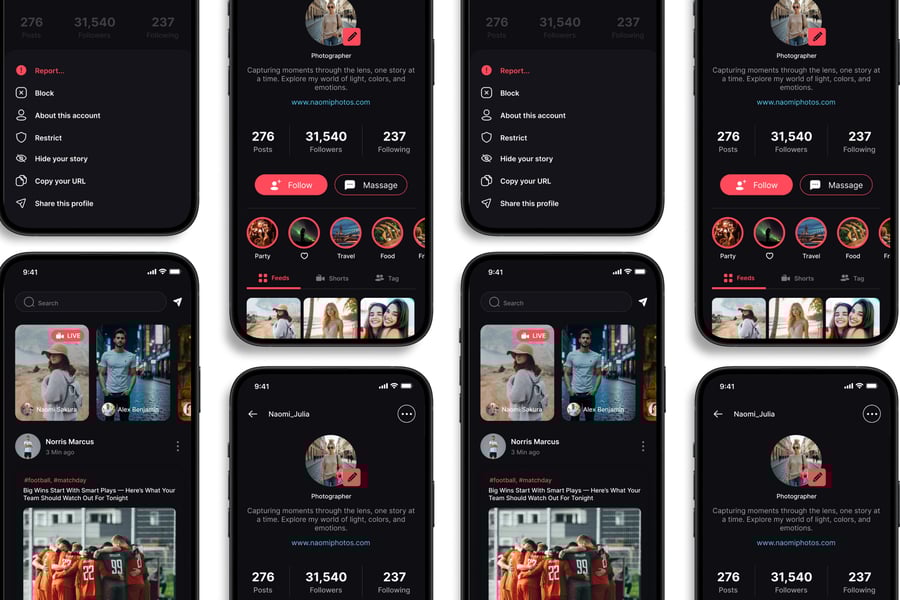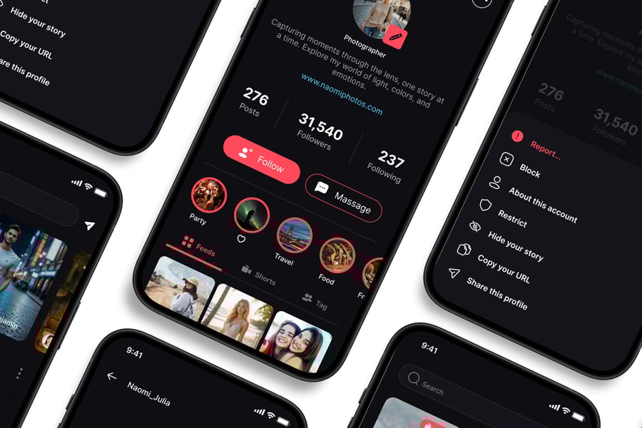 这款**社交媒体** UI 工具包的设计重点在于易用性和一致性,让您轻松创建美观实用的移动应用。每个元素都经过精心设计,完全可定制,并可根据您的品牌进行调整。无论您是设计社交应用、电商应用还是效率工具,这款工具包都能让您灵活地将创意变为现实。