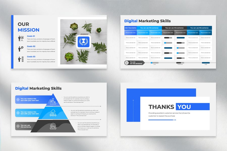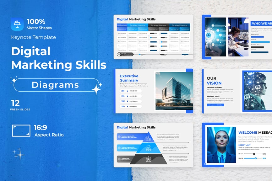 数字营销技能主题演讲模板是一个令人印象深刻的图表模板,它通过管状图增强销售和营销概念的视觉效果。