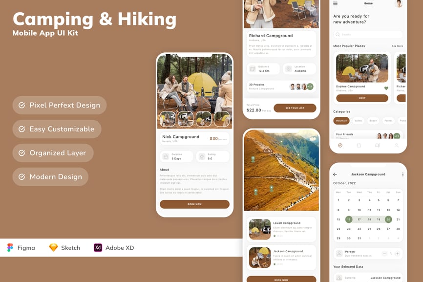 每个屏幕都可完全自定义,易于使用,并针对 Figma、Sketch 和 Adobe XD 进行了精心设计。