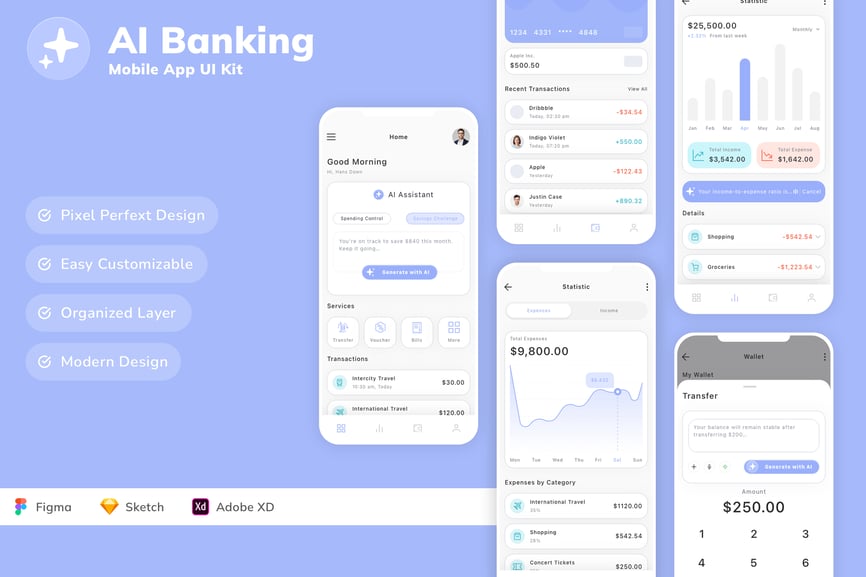 每个屏幕都可完全自定义,易于使用,并针对 Figma、Sketch 和 Adobe XD 进行了精心设计。