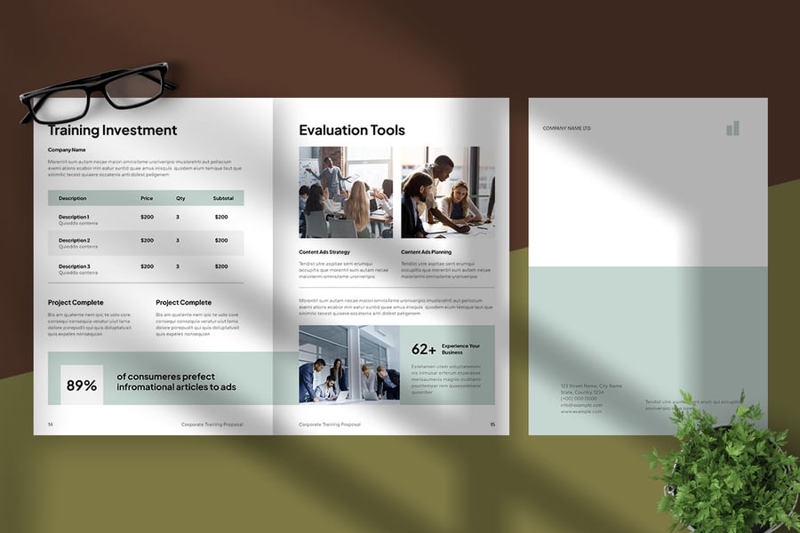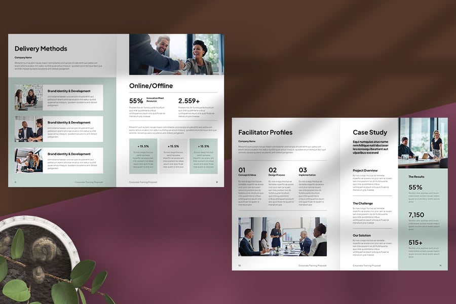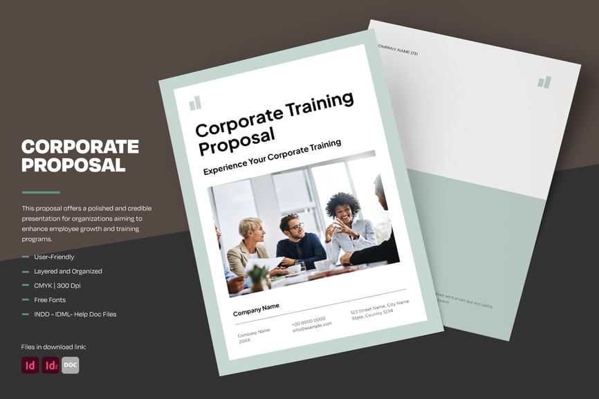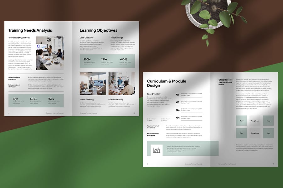此提案模板设计简洁现代,以柔和的薄荷绿色点缀,带来清新专业的格调。其结构化的布局涵盖培训需求分析、学习目标、课程设计、讲师简介和案例研究等部分,非常适合企业环境。留白与绿色高亮的均衡运用确保了清晰度和可读性,而井然有序的格式则有助于清晰地传达目标、策略和成果。此提案非常适合专业发展项目,为旨在提升员工成长和培训项目的组织提供了精美可信的演示文稿。