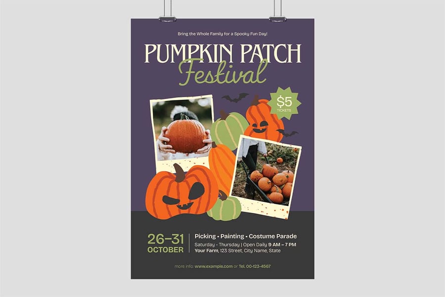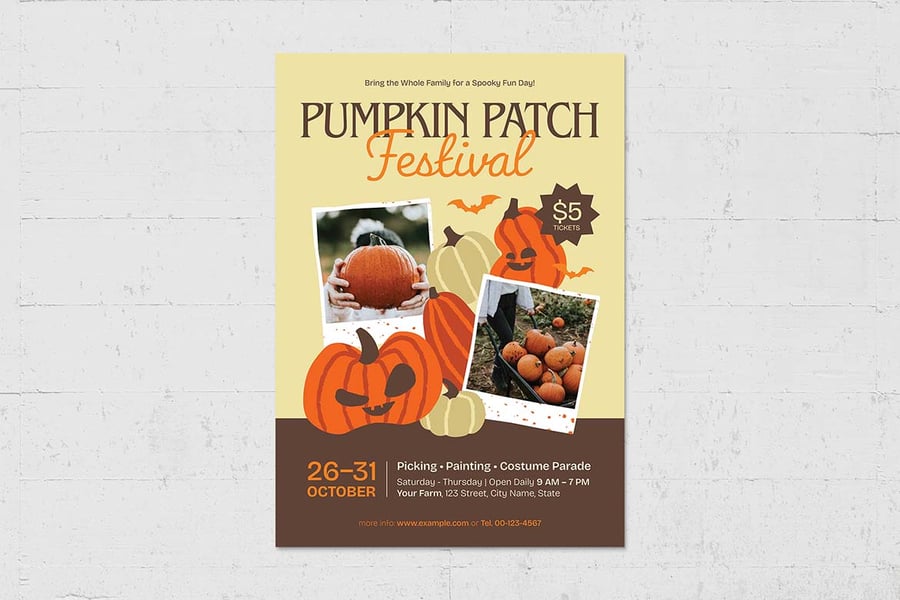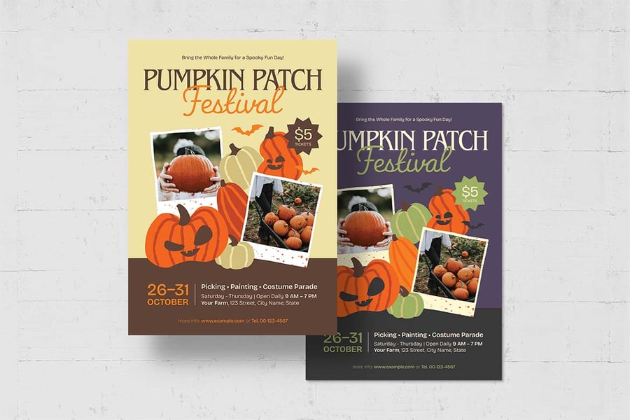 **万圣节家庭活动南瓜地传单 • Illustrator Ai、Vector EPS、Photoshop PSD 和 Canva**