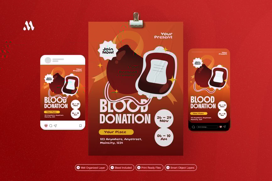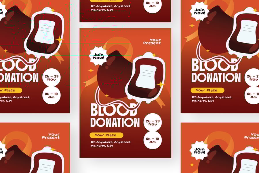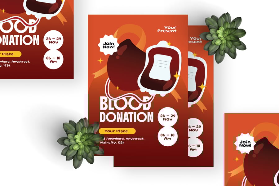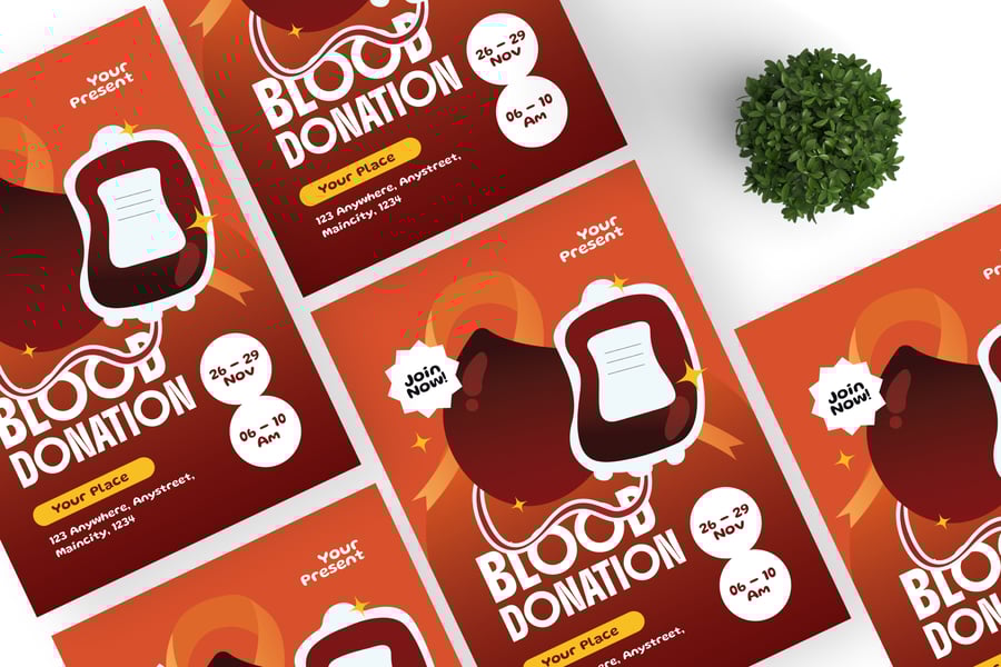 我们的**献血**传单套装带来震撼的视觉冲击。我们精心设计,可根据您的品牌或业务进行个性化定制。无论您展示哪个行业、服务或产品,我们都能为您提供理想的传单套装。