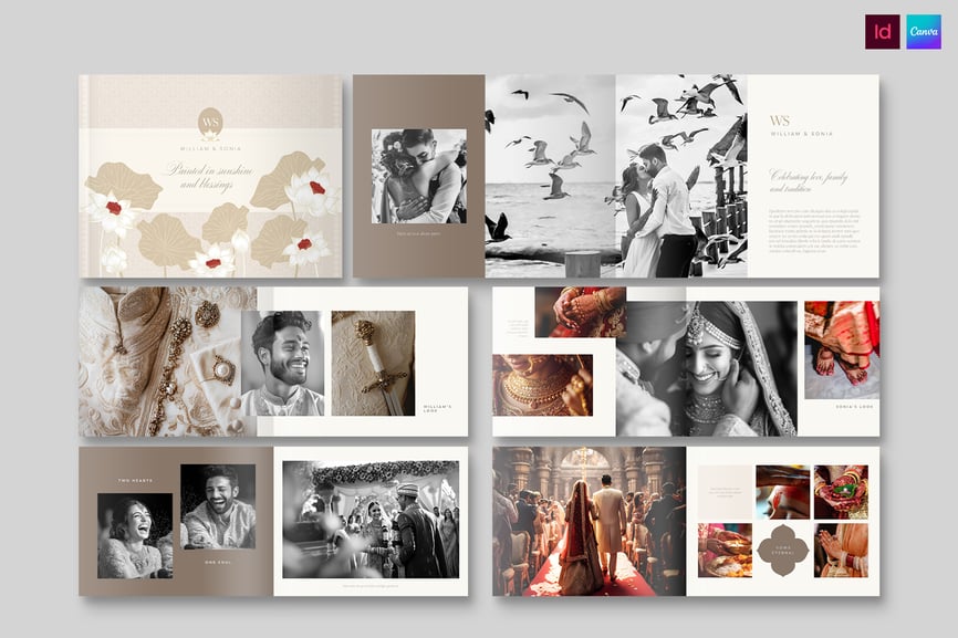 可在 Canva、InDesign IDML 和 INDD 中编辑。非常适合文化庆典、婚前拍摄、周年纪念以及高级相册、作品集和传家宝纪念册。