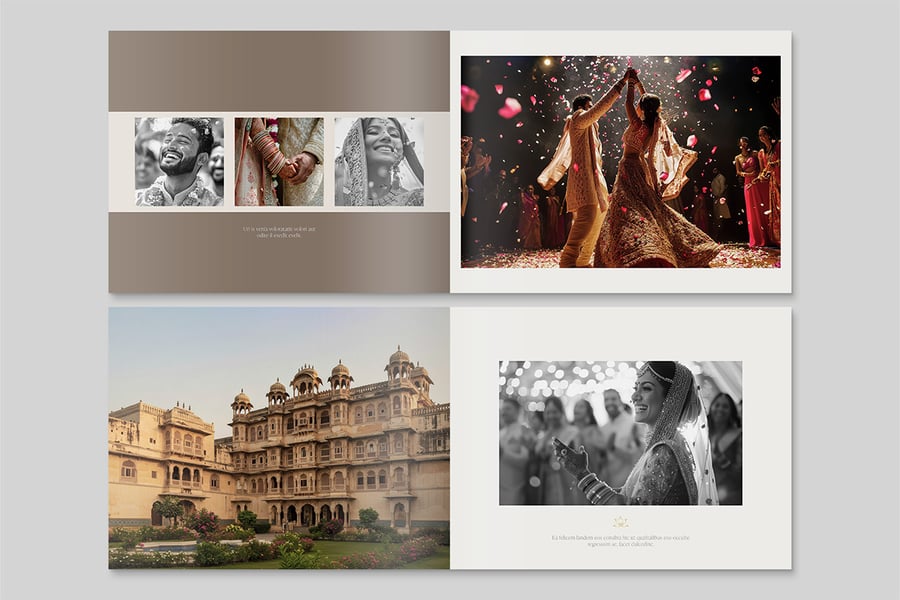印度婚礼相册模板——奢华的横向相册布局,用于捕捉曼海蒂、桑吉特、哈尔迪、订婚和婚宴的美好回忆。专为摄影师、工作室、策划师和寻求优雅拼贴故事书或咖啡桌纪念品的情侣设计。可打印的页面展示具有现代传统风格的肖像和仪式照片。