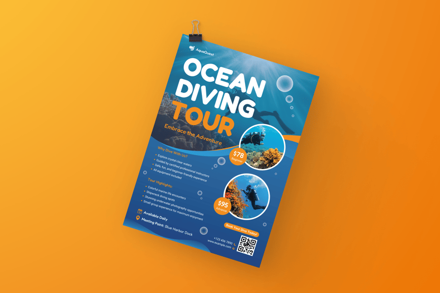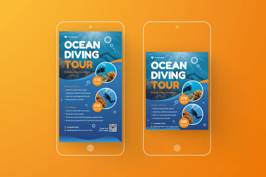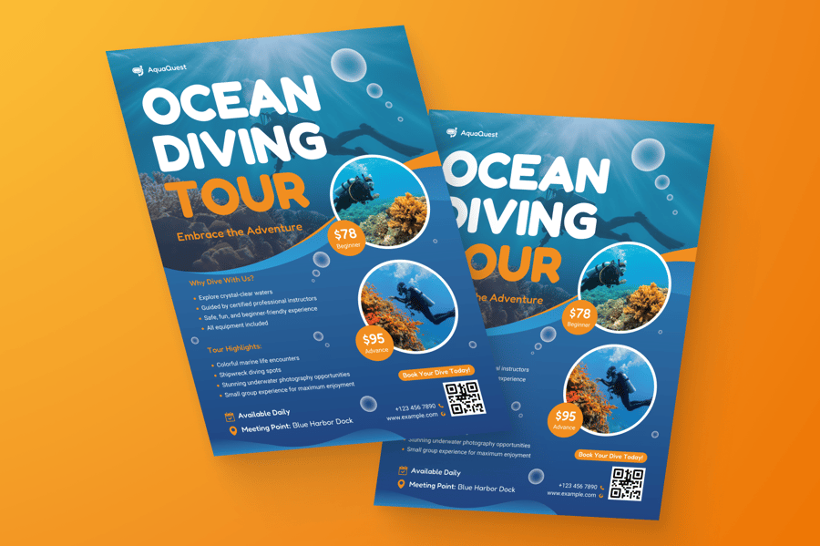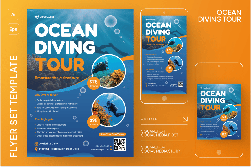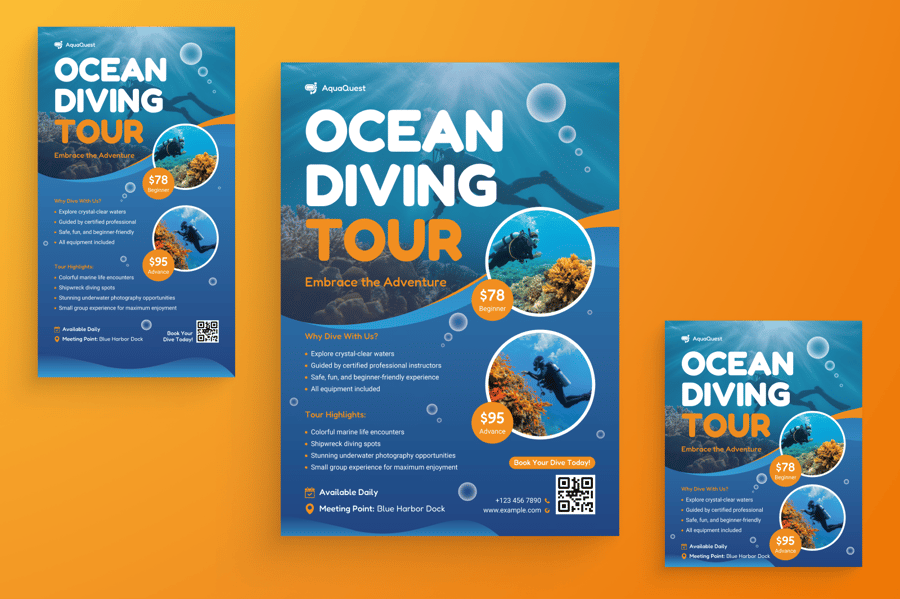 这套简洁、引人入胜的宣传单专为海洋旅游和潜水体验打造,助您开启精彩的冒险之旅。它非常适合旅行社、旅行社和度假村推广潜水套餐、水下探险或海滩活动。它采用平静清新的色调,以视觉方式展现海洋之美,是生态旅游、夏季旅行和探险营销的理想之选。
