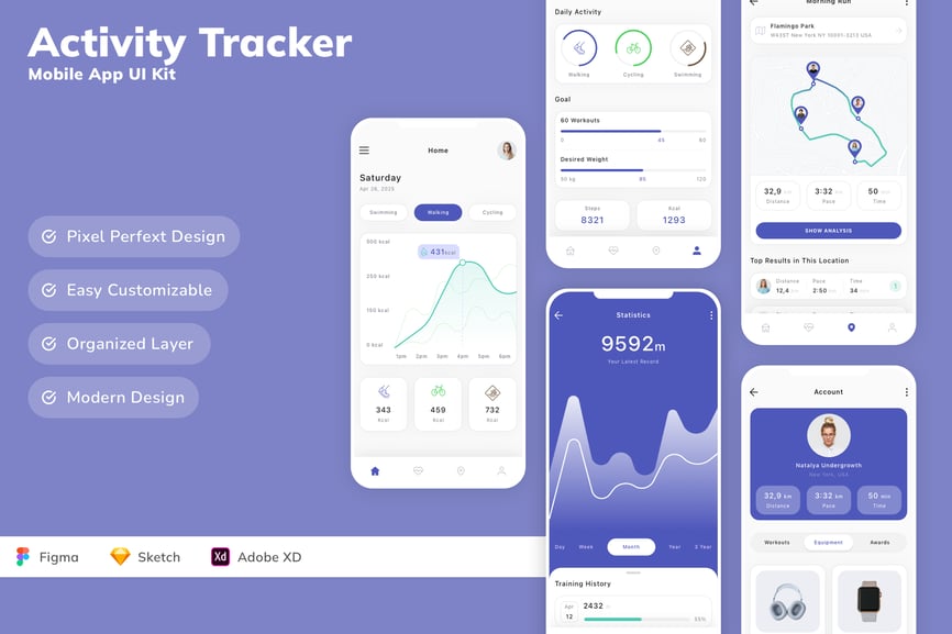 每个屏幕都可完全自定义,易于使用,并针对 Figma、Sketch 和 Adobe XD 进行了精心设计。