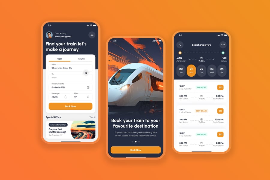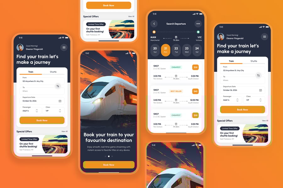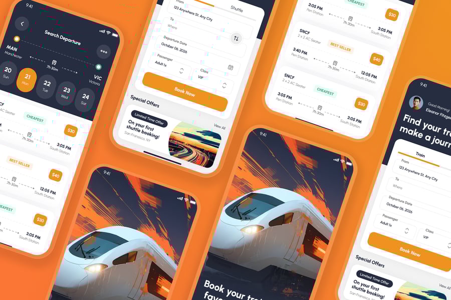 推出一款简洁易用的火车票预订移动应用UI套件,专为交通运输应用而设计,涵盖火车票预订、路线搜索、座位选择、时刻表管理、电子登机牌和支付确认等功能。该界面注重清晰度和效率,采用结构清晰的布局、易读的字体和直观的导航,确保用户获得流畅的预订体验。