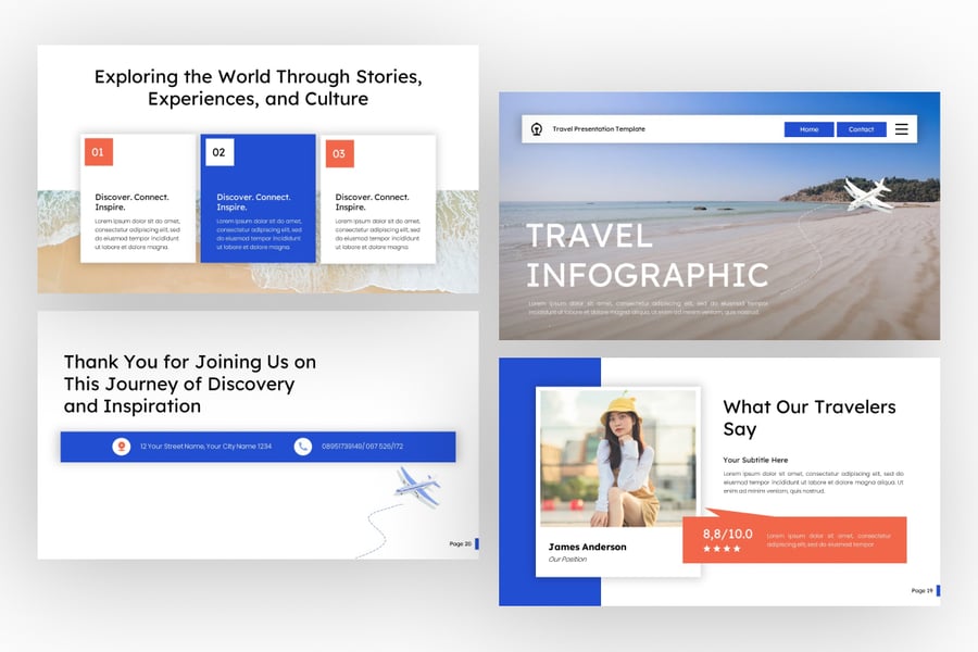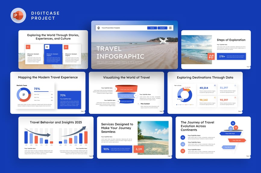 这款现代旅游信息图表 PowerPoint 模板旨在以时尚清晰的方式展示旅游数据、目的地分析和全球旅游趋势。