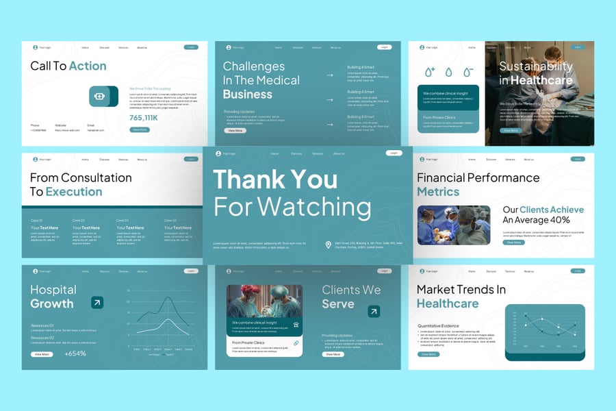 这款 PowerPoint 模板非常适合医疗保健高管、医生、顾问和医疗创业者,它完全可自定义,您可以调整颜色、图像、图表和布局,以匹配您的品牌形象。无论您是准备年度医疗报告、医院简介还是药品推介演示文稿,此演示模板都能确保您的信息具有影响力且令人信服。它包含专业设计的幻灯片,采用现代布局、引人入胜的视觉图形和可编辑图表,增强了故事叙述和数据可视化效果。此模板可完全自定义以适应任何行业,助您打造引人注目、效果显著的制胜推介。适用于医疗业务 PowerPoint、医疗保健演示模板、医院简介幻灯片、医疗提案 PowerPoint、诊所业务演示、药品 PowerPoint 模板、医疗保健营销幻灯片、患者护理演示和医学研究 PowerPoint。