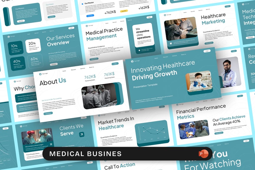 使用这款医疗商务 PowerPoint 演示模板,清晰专业地展示您的医疗保健理念、方案和报告。该模板设计简洁现代,专为医院、诊所、医疗保健初创公司、制药公司和医疗服务提供商量身打造。模板包含独特的幻灯片布局,适用于医疗商业计划、患者护理报告、研究报告、治疗信息图、服务概述和医疗保健营销策略。凭借专业的配色方案、医疗主题图标和数据驱动的图表,它能帮助您有效地向患者、利益相关者或医疗专业人员传达关键信息。