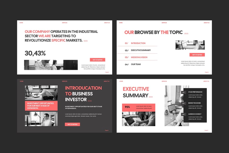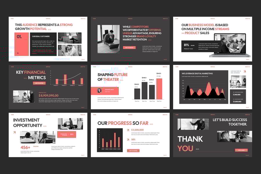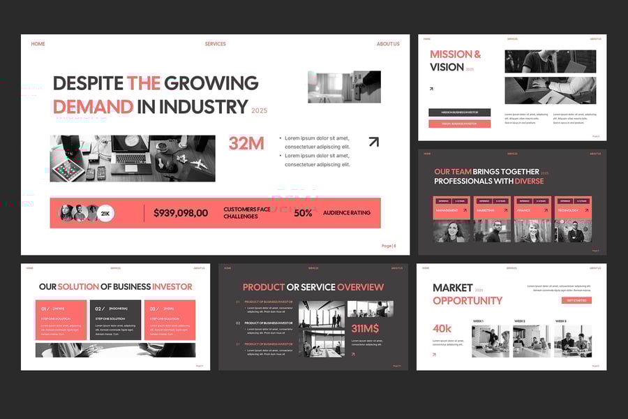 无论您是推介新项目、展示增长指标,还是展示战略业务路线图,此模板都提供了您所需的所有幻灯片,助您制作出引人入胜且足以获得投资的演示文稿。