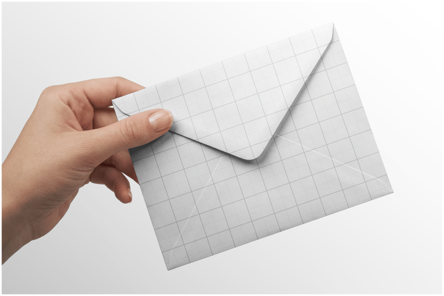 这款 PSD 模型展示了一个手持的现代蓝色信封,信封内部采用精致的几何图案设计,并留有充足的空间用于放置优雅的品牌标识。