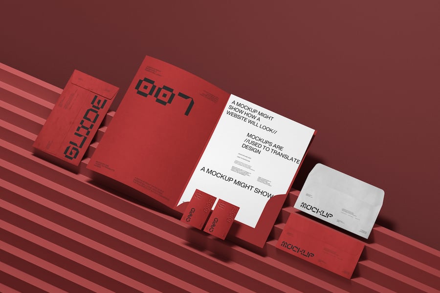 这套模型素材包含一系列协调的办公用品,例如文件夹、信封、卡片和文件,用于展示品牌标识设计。它采用结构化的布局,有助于可视化品牌标识在多种印刷品上的应用效果